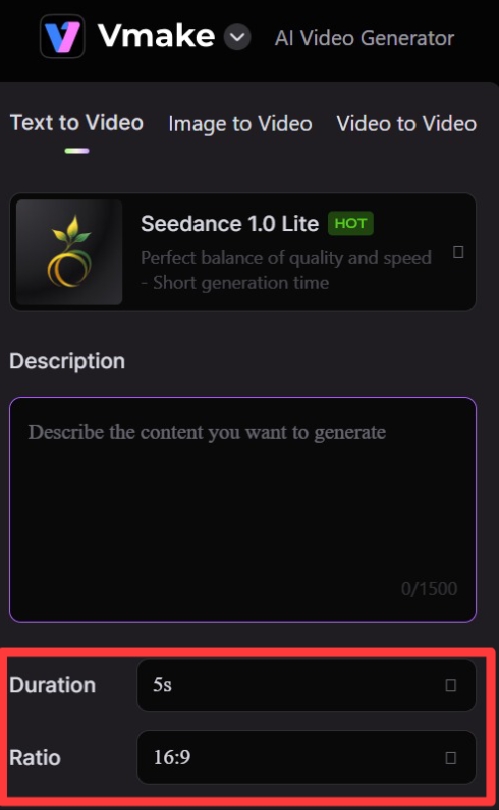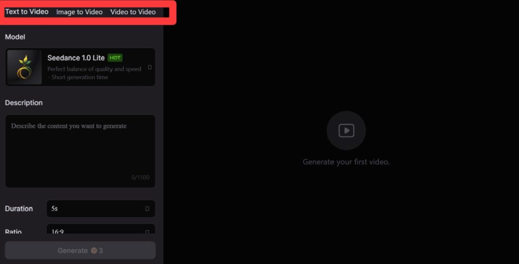 - Click on “Text to Video,” “Image to Video,” or “Video to Video” prompt options at the top.