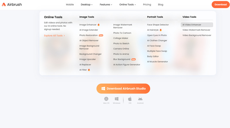 First of all, open the Airbrush official website and open the “Online Tools” drop-down menu. Now, click the “AI Video Enhancer” under the “Video Tools.”