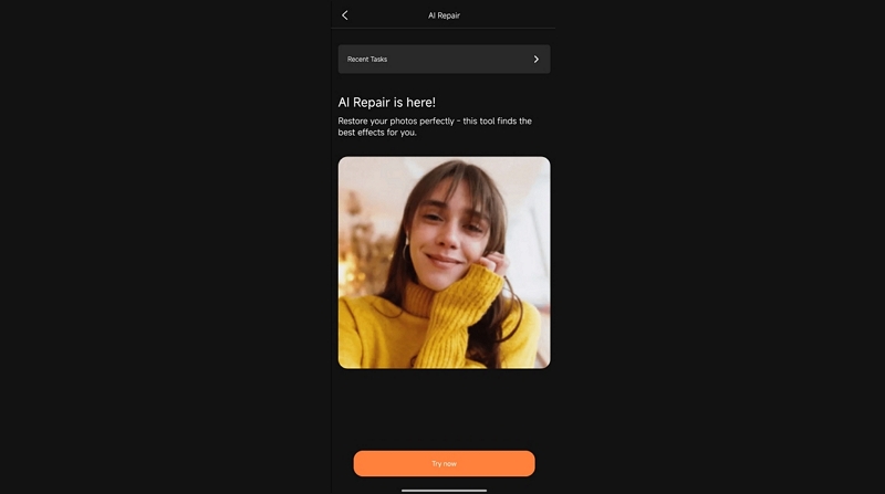 After installing and launching the mobile application, select the “AI Repair” tool, then click “Try Now” to proceed.