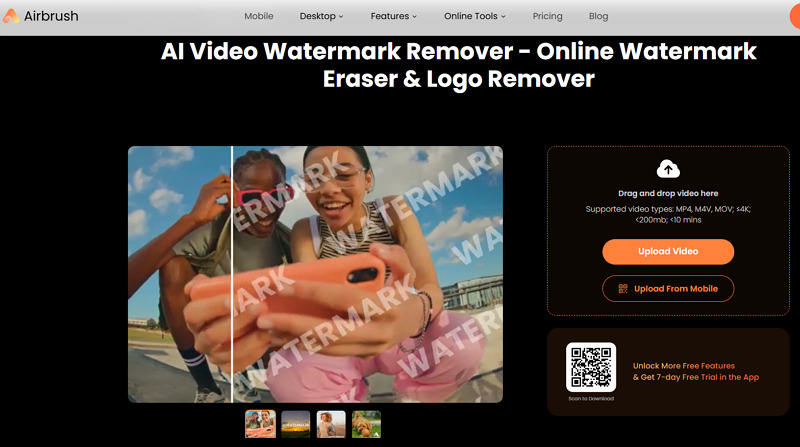 The first step is to access the Airbrush Video Watermark Remover. Now, tap the “Upload Video” or “Upload from Mobile” tab to proceed.