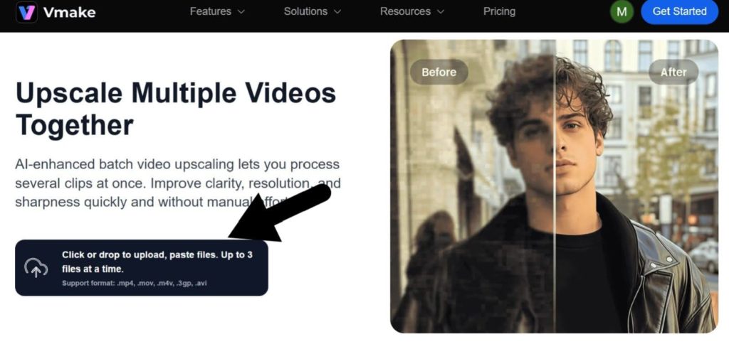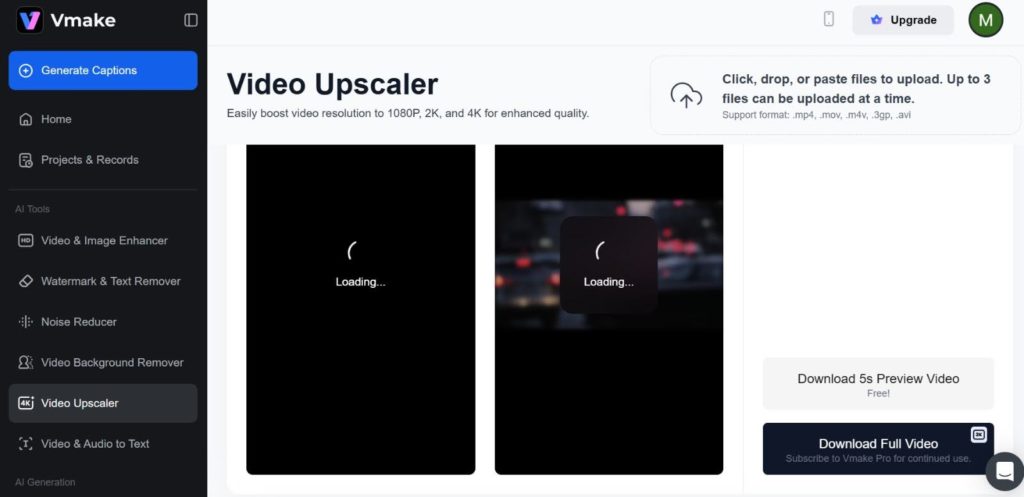 - Go to Vmake and click on upload. For multiple files, drag and drop them in Vmake enhancer one by one.