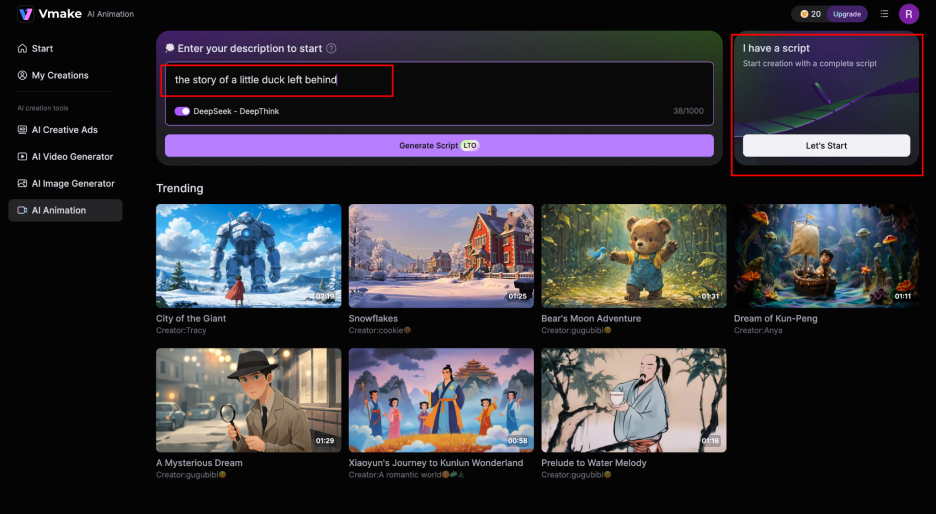 First of all, visit the Vmake AI Animation tool page. Now you have 2 options: the first one is for users who have their script ready, and the other one is for people who have just an idea of an animation.