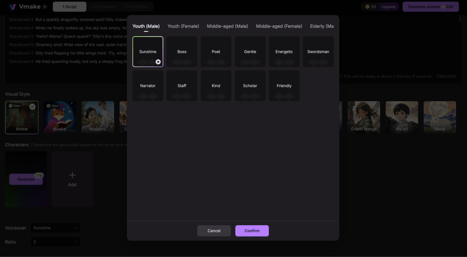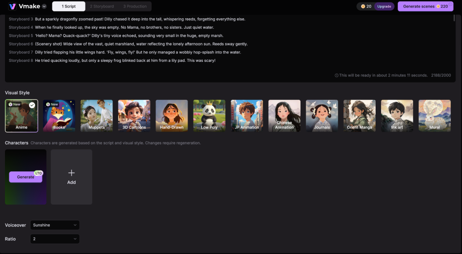 Now choose the Voiceover according to your need, set Ratio, and click Generate Scenes.