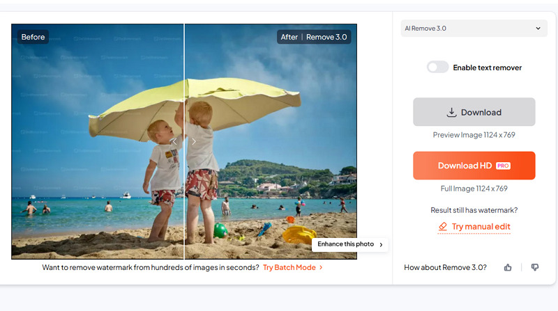 Its powerful recognition technology can detect and separate watermark layers with ease. It also offers a manual brush tool to erase the last traces of watermark to achieve HD results.