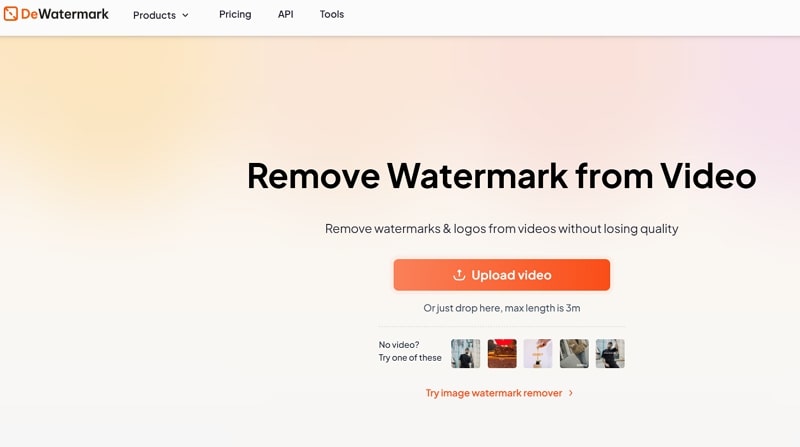 The first step is to access the DeWatermark Video Watermark Remover and click “Upload Video” or use the sample video to proceed.