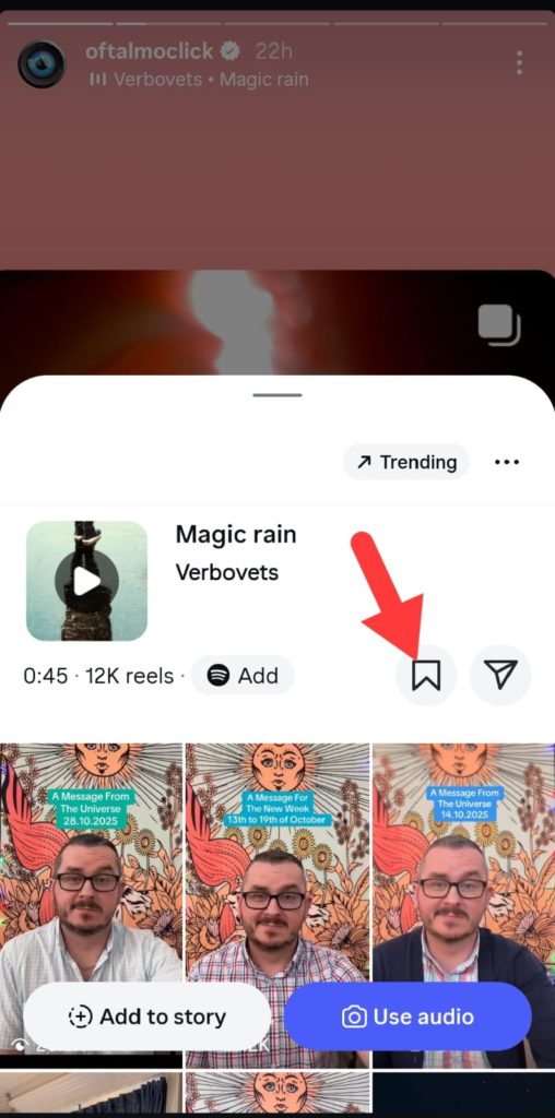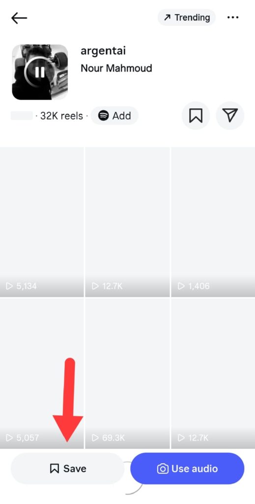When you find the trending audio from reels, click on the audio option. Once redirected to the audio page, click on use audio. Add video, edit it, and post it. If you want to use it later, click on the “save” option.
