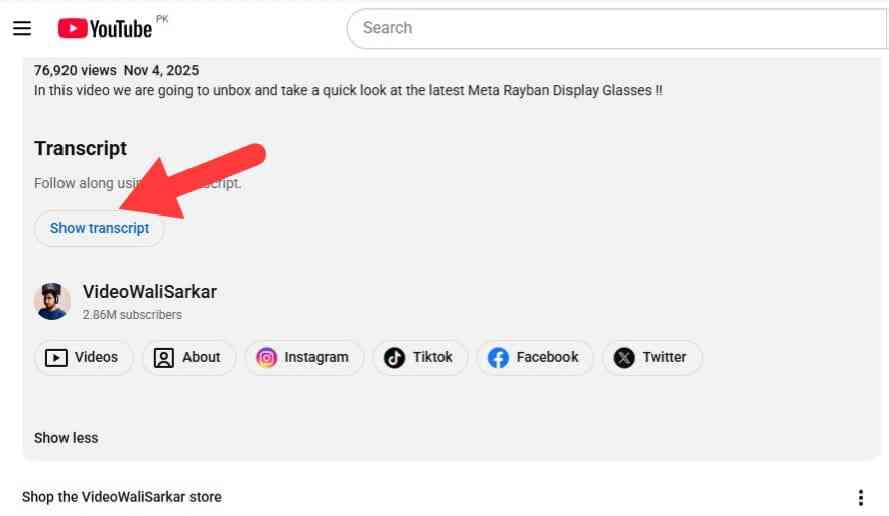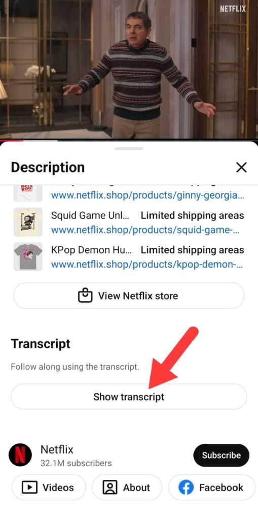 - Step 4: Skip the description and continue scrolling. There you will find the “Transcript.”