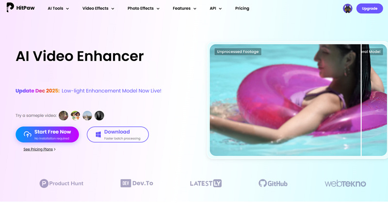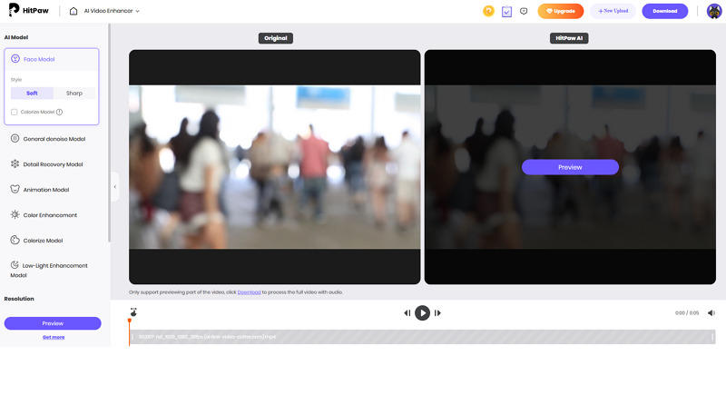 HitPaw AI Video Enhancer is undoubtedly one of the best online video quality enhancers on the market, delivering vibrant, smooth visuals. It offers various models to improve video clarity, reduce noise, restore old footage, and upscale to 4K resolution without sacrificing quality.