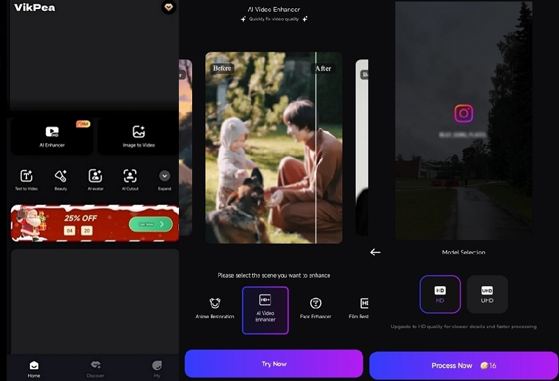 VikPea AI Video Enhancer is a remarkable mobile application, primarily designed to sharpen, colorize, upscale, and optimize videos with high-definition clarity. With various models, you can enhance facial features, boost vibrancy, add colors to b&w footage, brighten dark scenes, beautify & smoothen skin, and more. It can even restore old footage and upscale it to 4K resolution with enhanced details.