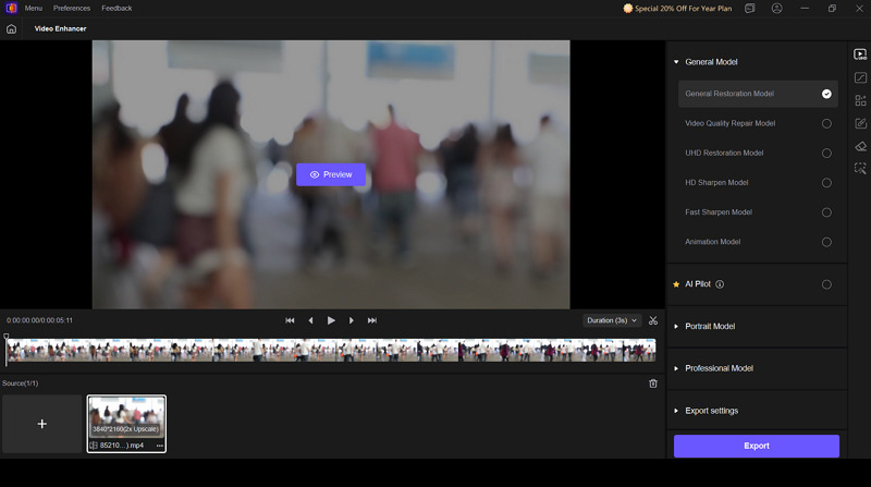 Next, select the desired AI model from any category: General, AI Pilot, Portrait, or Professional. You can also choose the resolution under “Export Settings.”