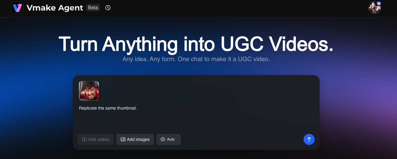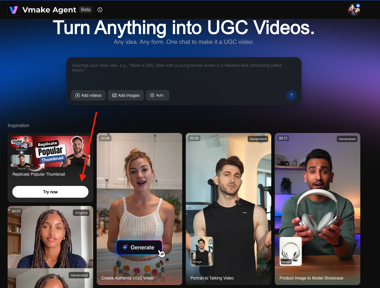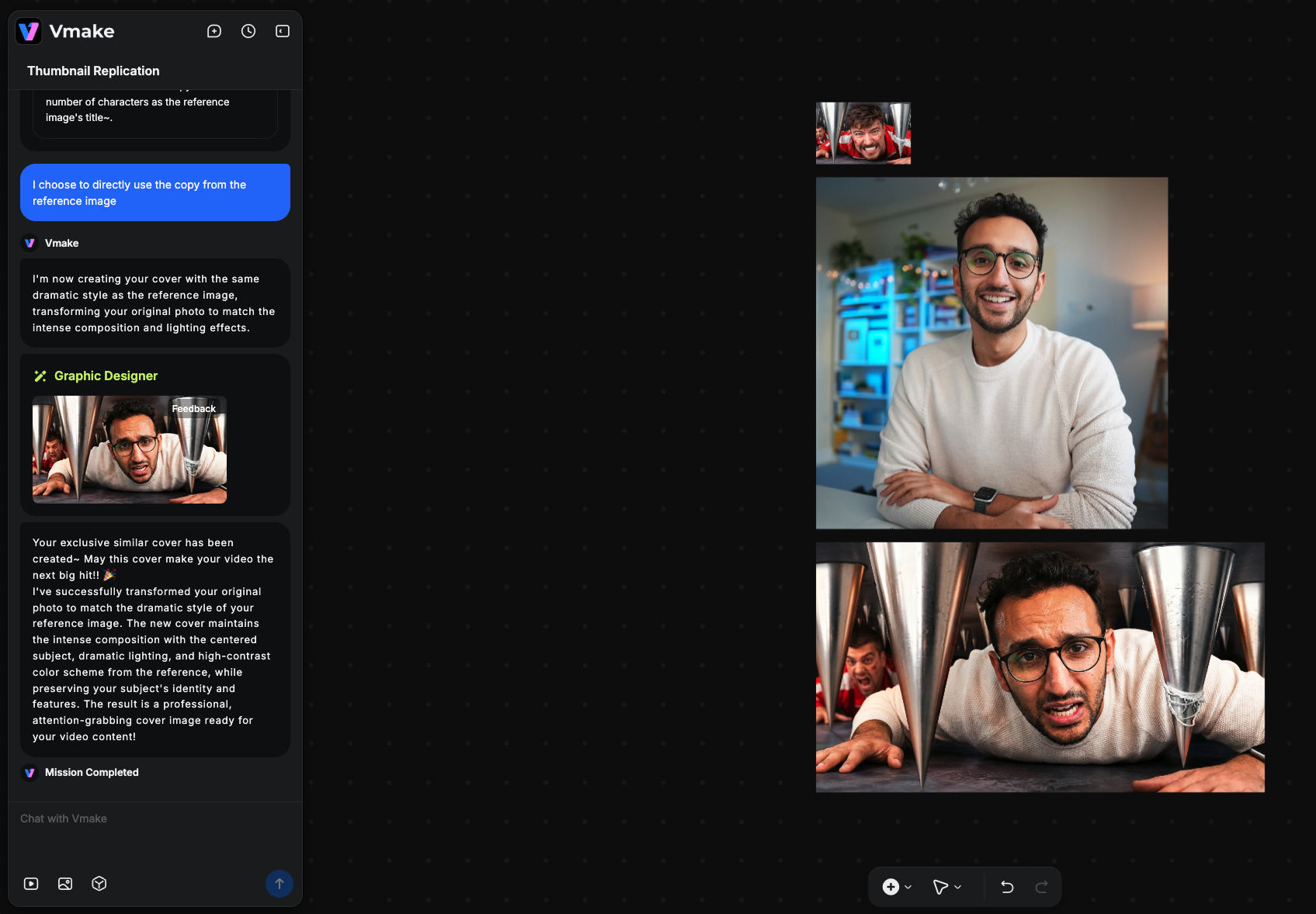 Vmake Agent has an AI thumbnail creator that can recreate trending YouTube thumbnails in one click. It’s integrated with the Nano Banana Pro model, giving you sharper expressions, richer colours, and true “viral YouTube thumbnail” energy — all without design experience, long editing hours, or any cost.