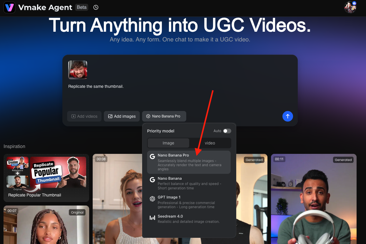 Visit Vmake Agent, open Replicate Popular Thumbnail, enable Nano Banana Pro, and create your first viral YouTube thumbnail in seconds.