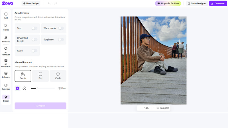 It’s time to choose the “Eraser” tool from the side column. Next, either enable the “Unwanted People” button or manually select the people you want to remove.