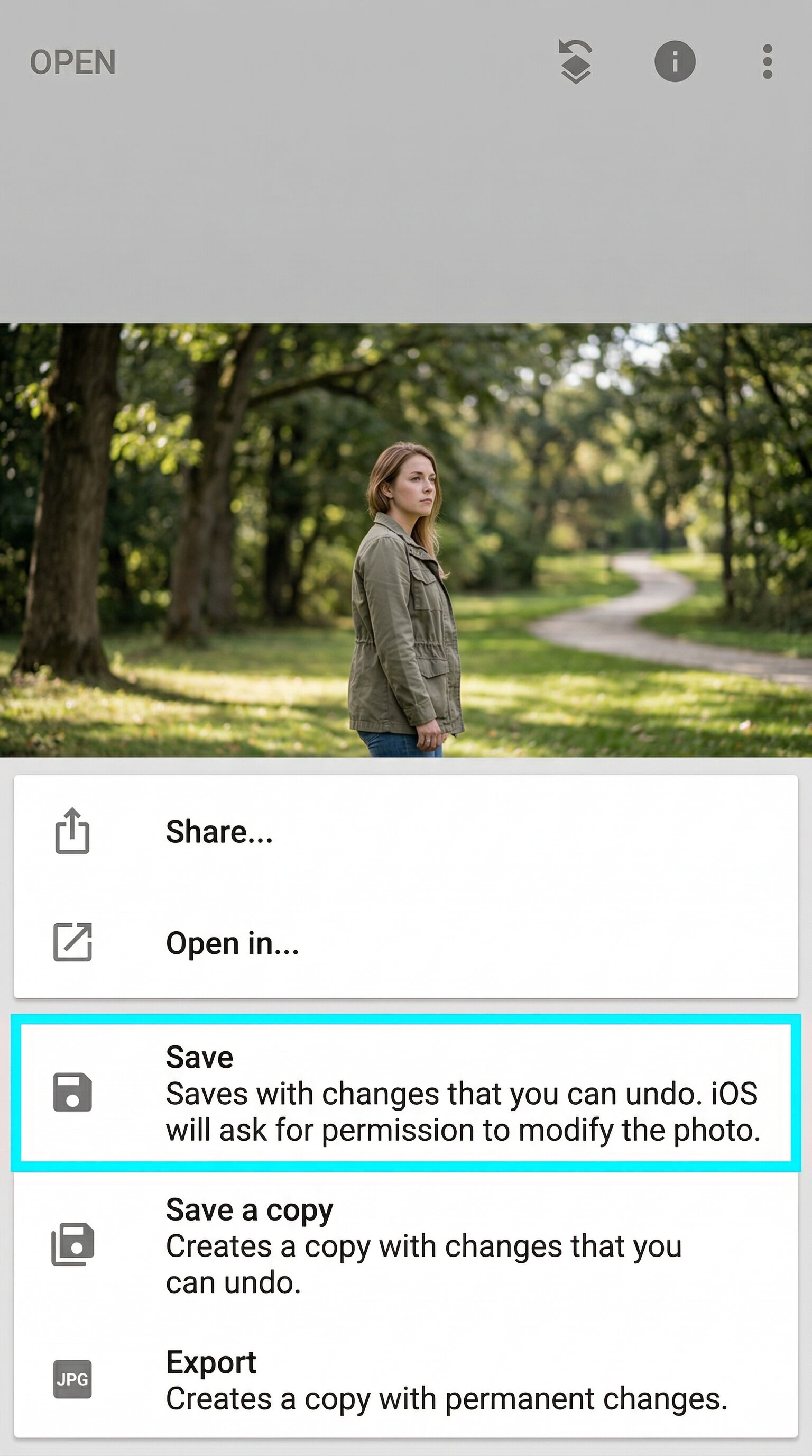 Save Your Edit: Once the person has disappeared, tap the checkmark to apply the changes and then select "Export" to save your work.