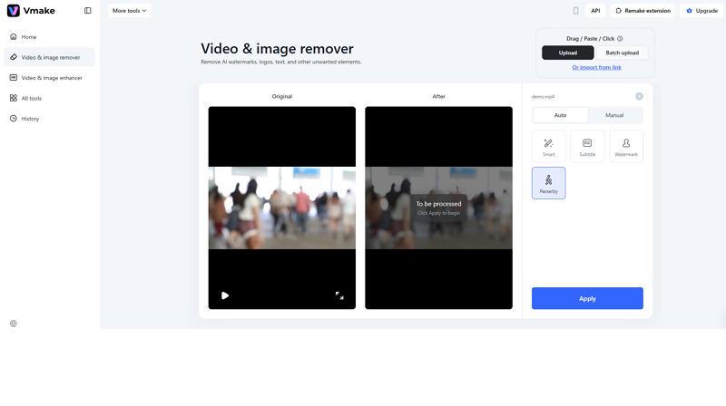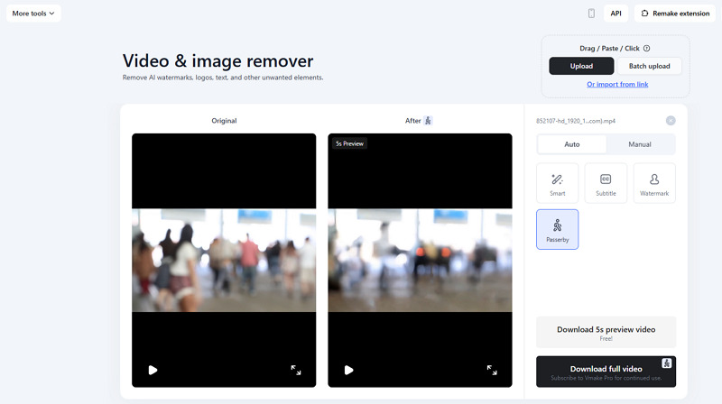 Vmake Remove People is an AI-powered tool that is capable of automatically detecting and removing people from both videos and photos. You can also erase watermarks, logos, text, or other unwanted elements. It can handle moving objects frame by frame to deliver professional-looking results. Whether you are dealing with a quick social media clip or a more professional video project, this online platform can help streamline the process.