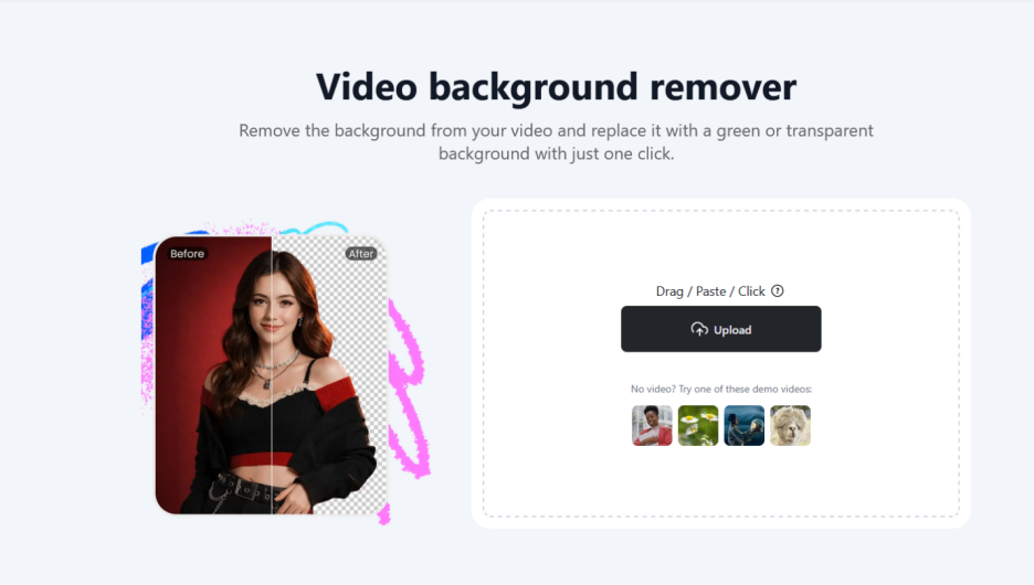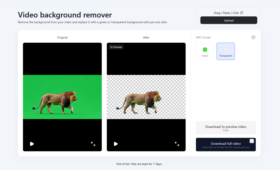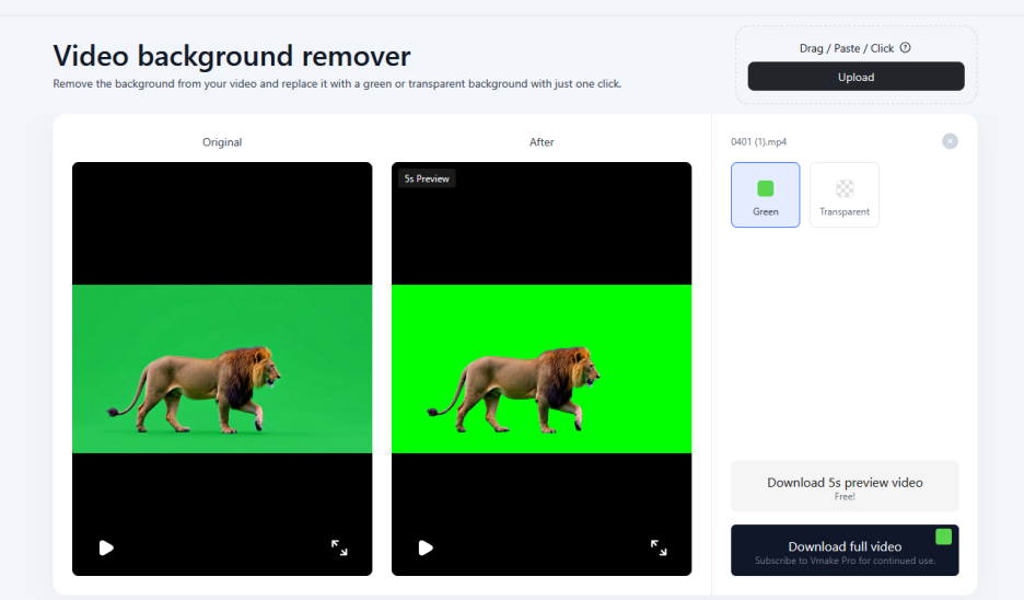 First, you will need to choose a video that you want to upload. You go to Vmake Video Background Remover, and then press Upload, choose your video, and wait a few seconds until the video is loaded. The AI will automatically detect the green video background.