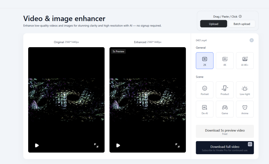 In order to get the best results, it’s a good idea to use an online video enhancement tool like Vmake Video Enhancer. The tool is free to use, it allows you to enhance video quality online, while also previewing the results before you download. It’s the ultimate solution for those of us that have videos with mosaic effects and pixelation!