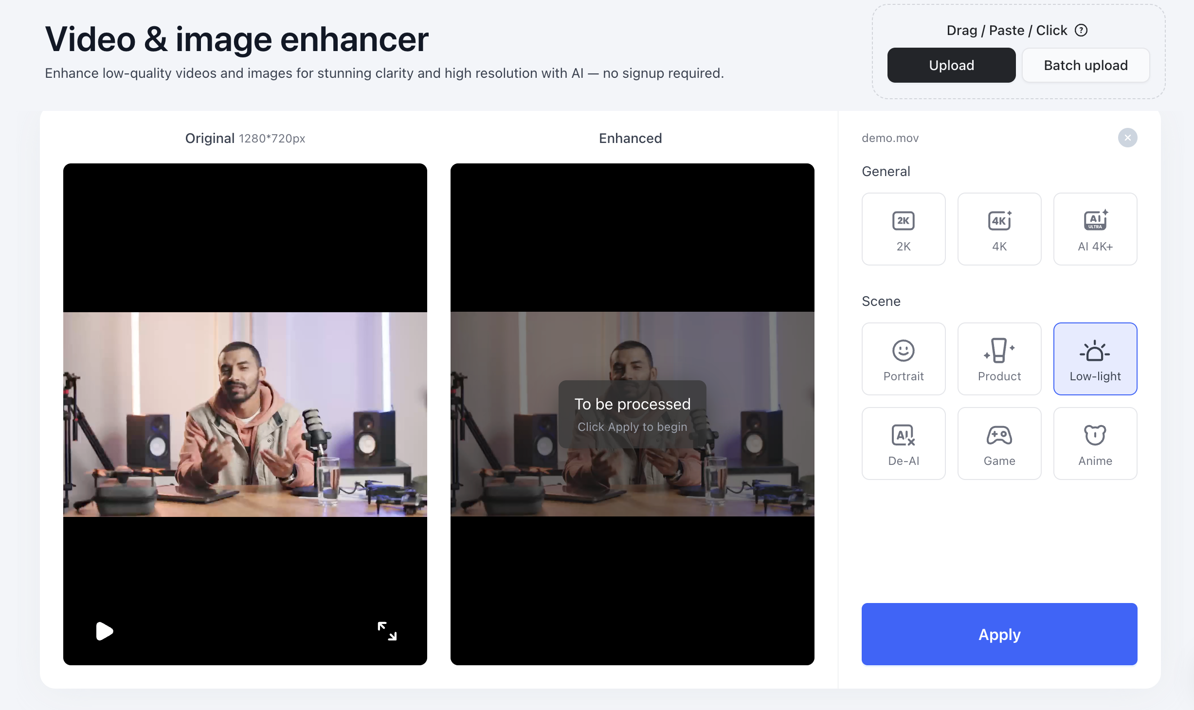 After uploading, you can choose how to enhance the video. You can upscale the video, but also optimize it for a certain format. You can also have low-light, remove AI features from the video, and so on.