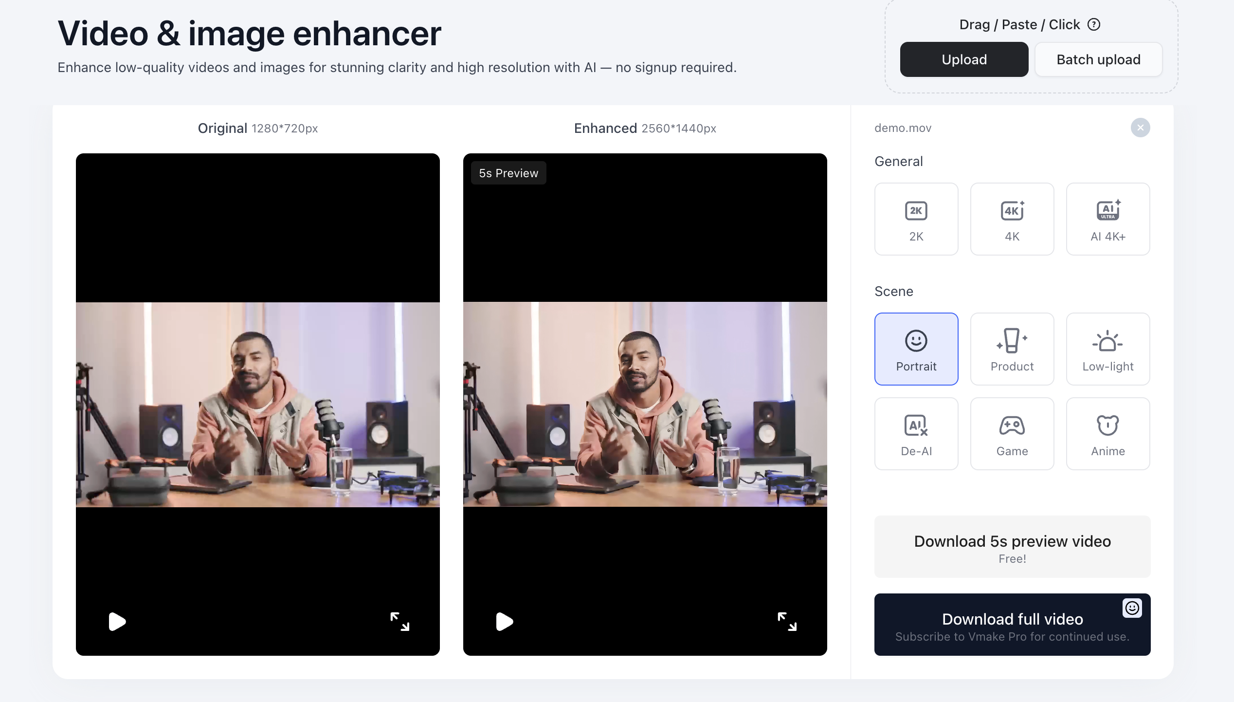 AI tools can be great if you want to reduce the occurrence of mosaic effects in a video. Such tools use machine learning models that were trained beforehand to reduce pixelation, sharpen the edges, and restore lost details from the video. The Vmake video enhancer is a prime example, as this tool makes it easy to harness AI features in order to restore pixelated videos to a much better, more visually appealing result.