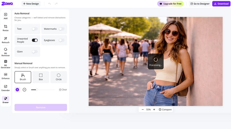 This efficient browser-based tool uses advanced algorithms to detect and remove unwanted people while intelligently filling in the background. You can access both manual and automatic options to remove BG person, text, watermarks, eyeglasses, or glare. It also offers a specialized background removal and generation, if needed. You can even preview the output for a better comparison before downloading.