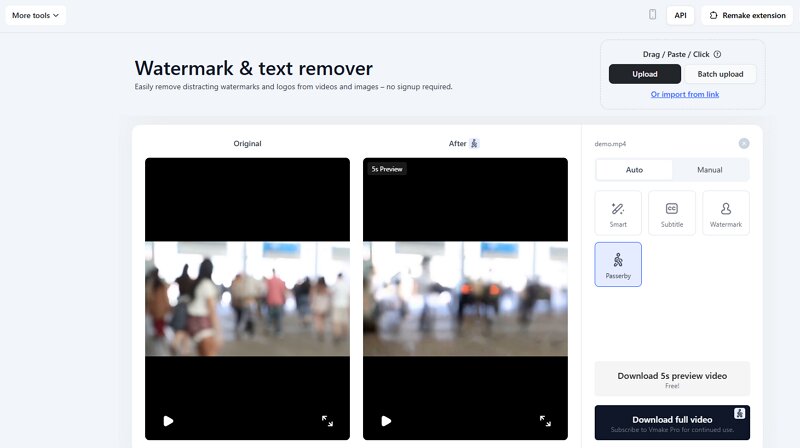 When the AI finishes removing the background people, hit “Download 5s preview video” or “Download full video.” That’s all!