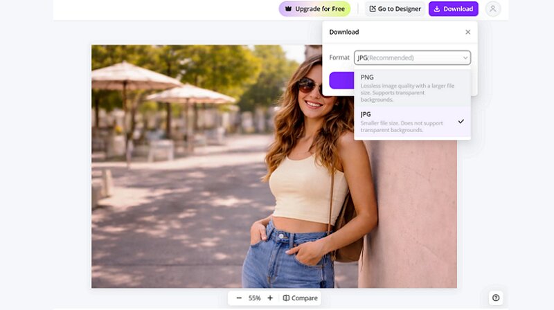 Lastly, press the “Remove” button. Once the AI has finished processing, tap “Download,” select the format, and hit “Download” again. You’re all done!