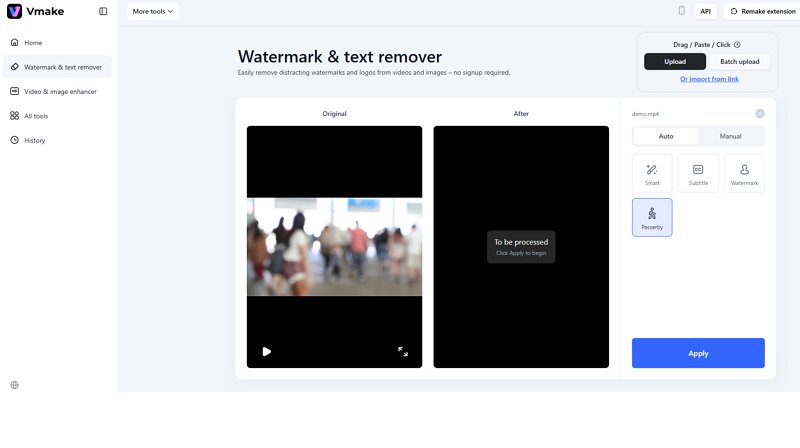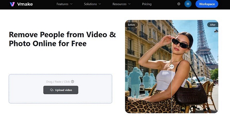 Vmake Remove People is a fantastic online tool, designed specifically for video editing, helping you remove people frame by frame using the auto or manual feature.