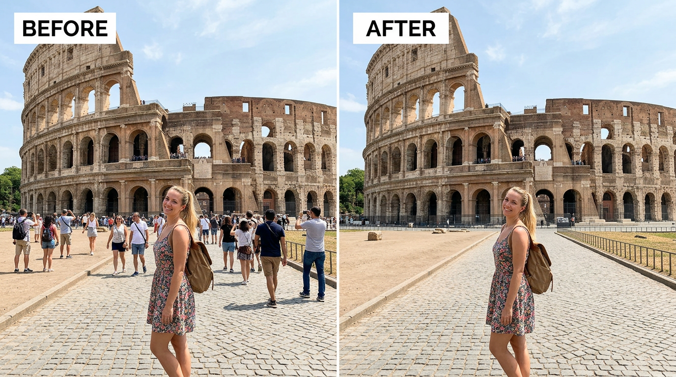 Travel photography — You've travelled hours to reach somewhere worth photographing, and the moment you press the shutter, a group of tourists walks straight through. Removing them gives you the clean shot you actually came for.