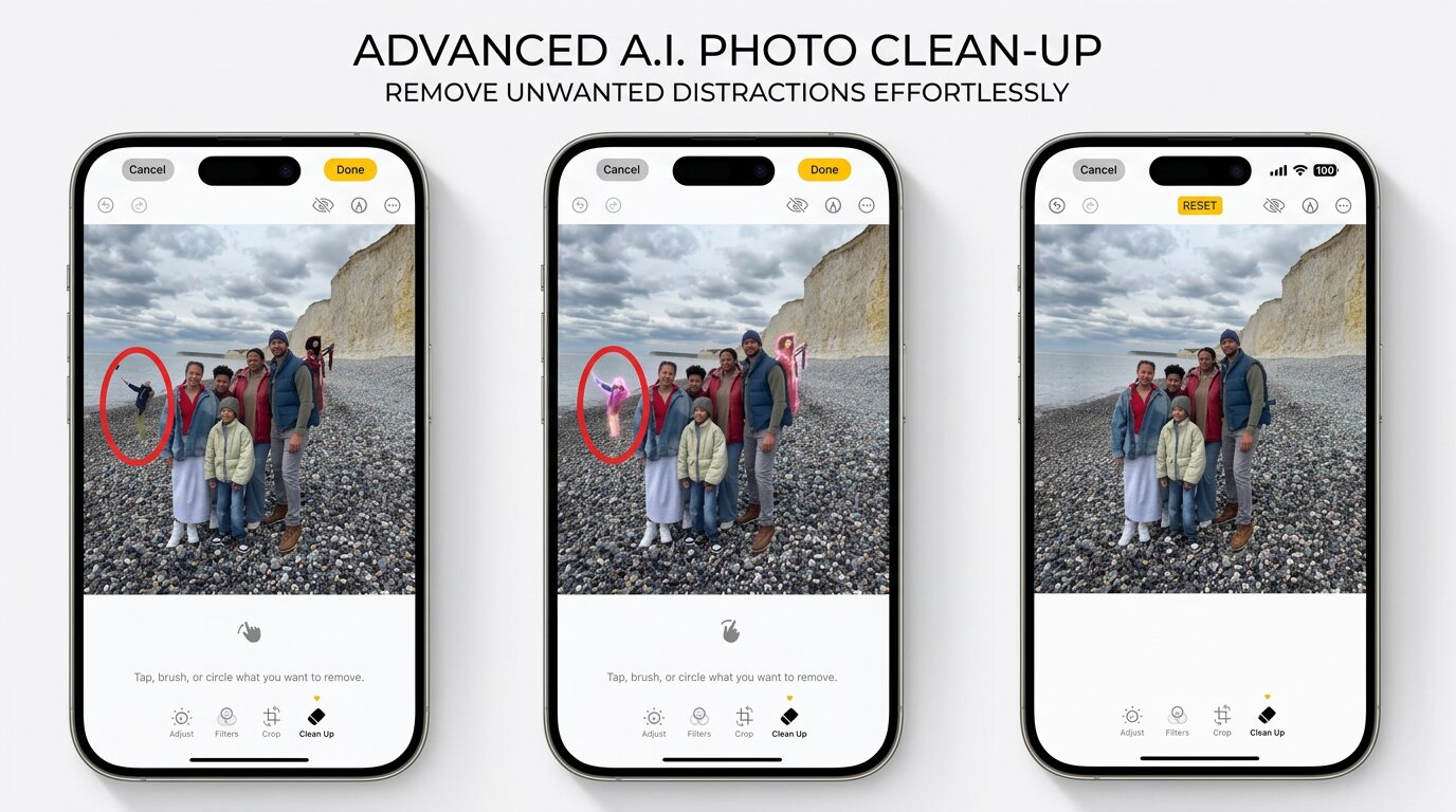 Apple quietly added a tool called Clean Up to the Photos app when iOS 18 rolled out. If your iPhone is already on iOS 18 or newer, you've had it this whole time and may not even know it. It runs on Apple Intelligence and handles the heavy lifting of detecting what doesn't belong in a photo, then fills the gap with whatever should logically be behind it.