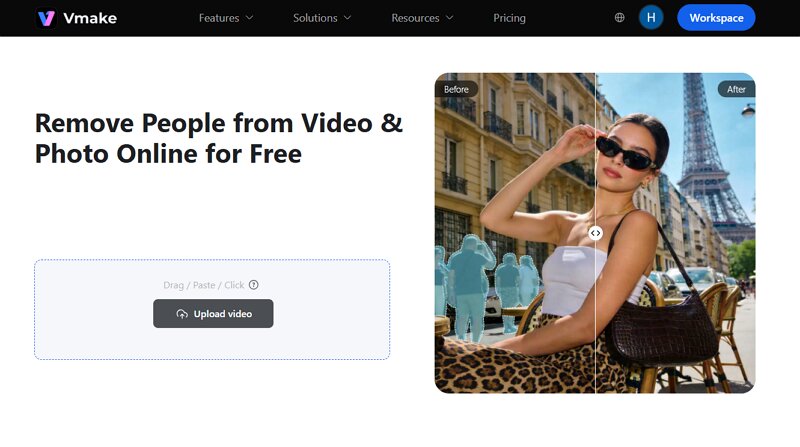 Removing people from photos is useful, but what about videos? That’s where the Vmake Remove People tool comes in handy. This superb platform can quickly remove unwanted watermarks, subtitles, and people from videos in a blink.