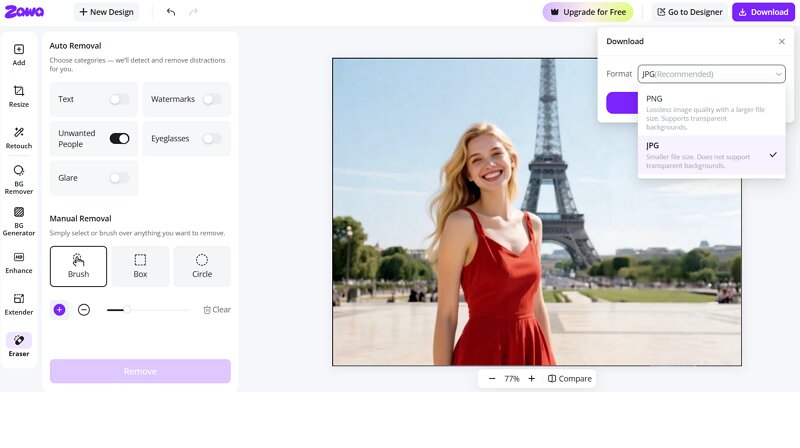 Lastly, press the “Remove” button and let AI finish the processing. Once done, tap “Download,” choose the output format, and hit “Download” again. That’s all!