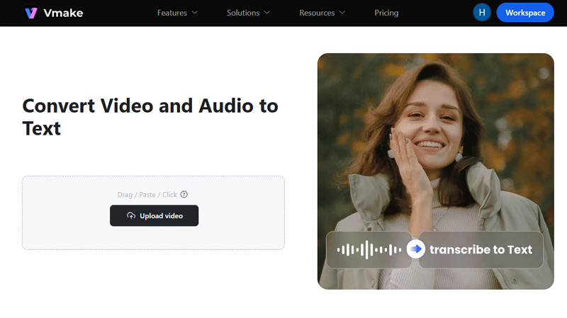 First of all, open the Vmake Video to Text tool in your browser. Now, upload the media file you want to transcribe to proceed.