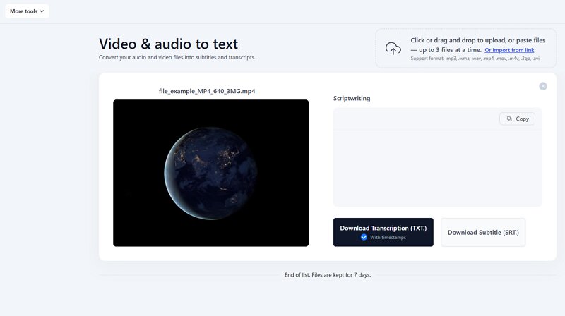 Once the AI has finished the transcription, you can preview the results. Lastly, hit “Download Transcription (.TXT)” or “Download Subtitle (.SRT).” All done!