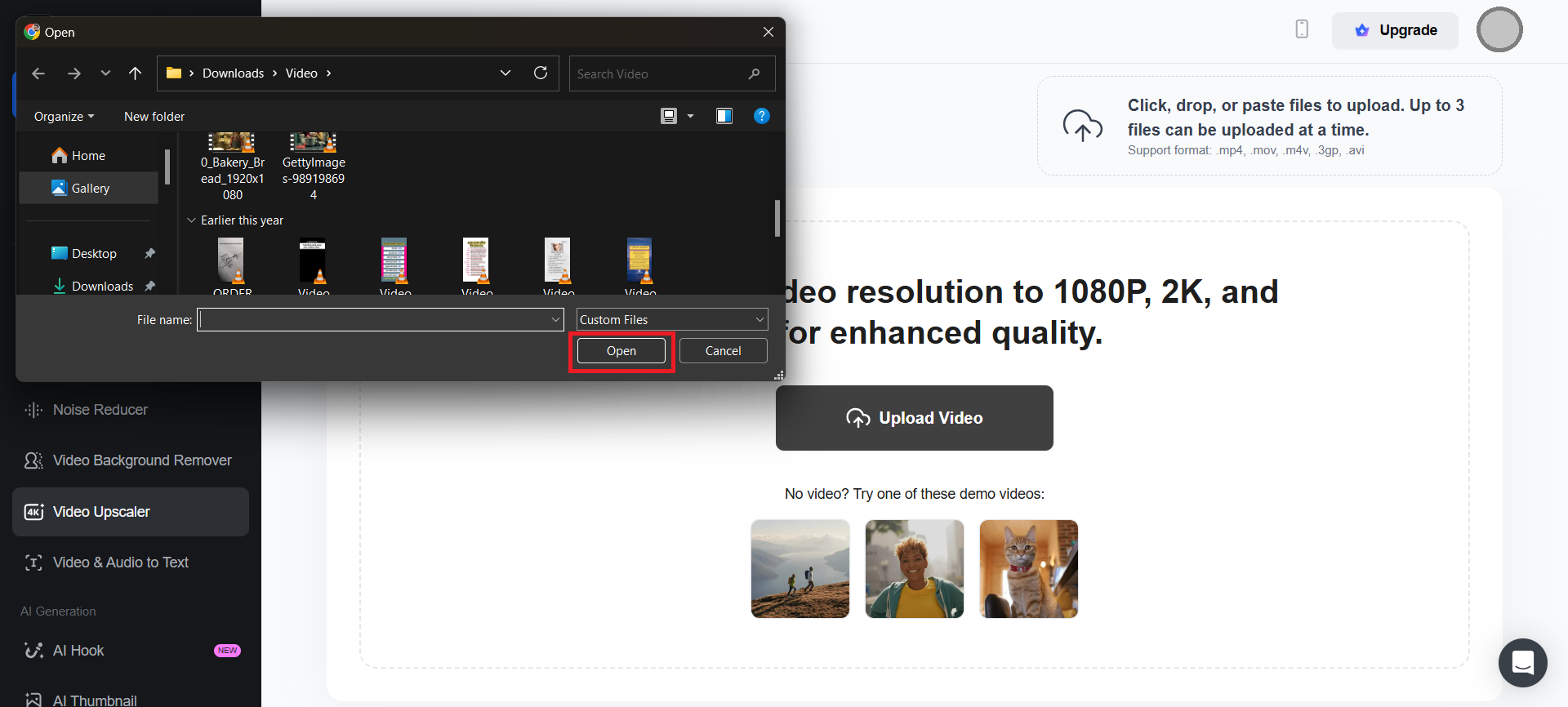 - File size limit: 200MB per video, with a maximum of 3 files at once.