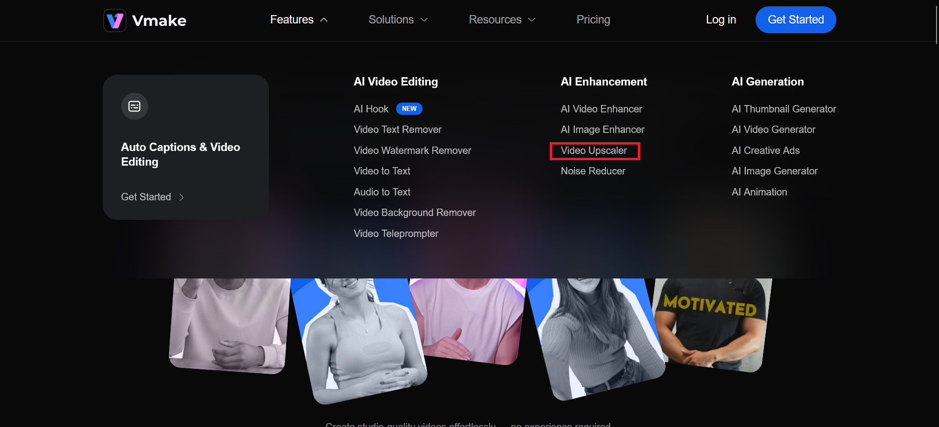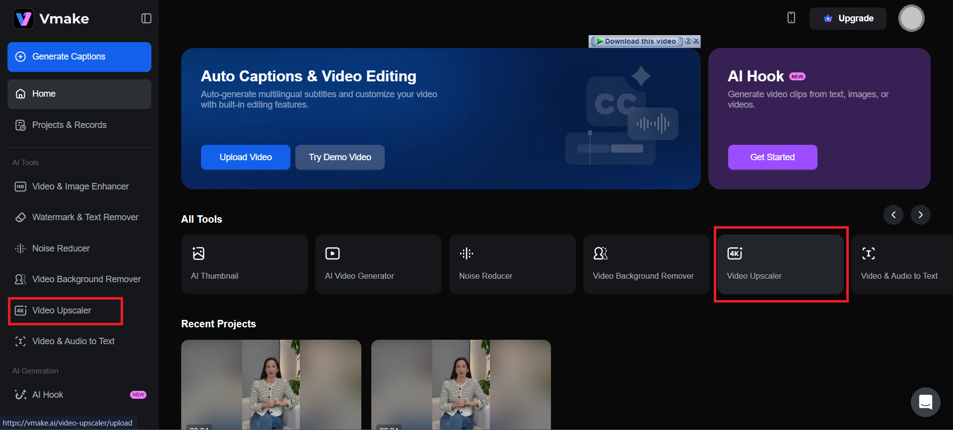 Navigate to Vmake.ai’s AI Video Upscaler. The platform offers multiple enhancement tools. For improved resolution, select “AI Video Upscale” from the “Video Quality Enhancer” section.