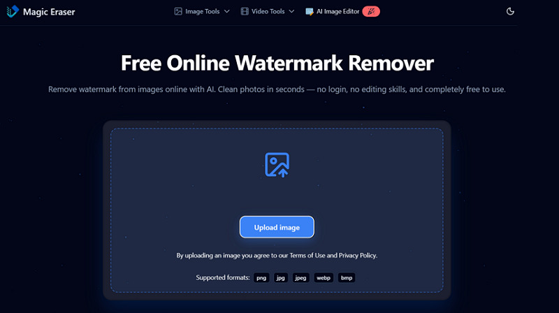 First of all, open the Magic Erase Watermark Remover tool and click “Upload image” to import the watermark photo.