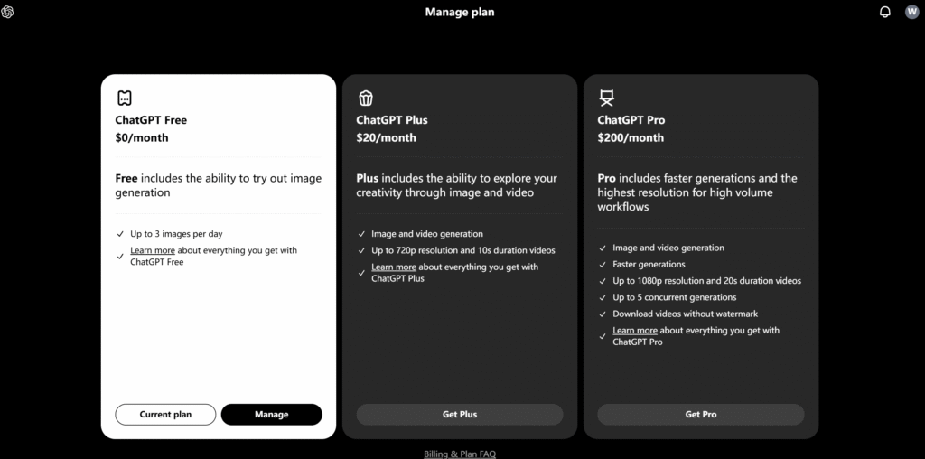 - For ChatGPT Plus and Business: ChatGPT Plus subscription costs $20/month and users can generate videos having resolution up to 720p. They can generate a video of maximum 10 seconds. In addition, it can take up to 7 days for them to be able to access the app.
