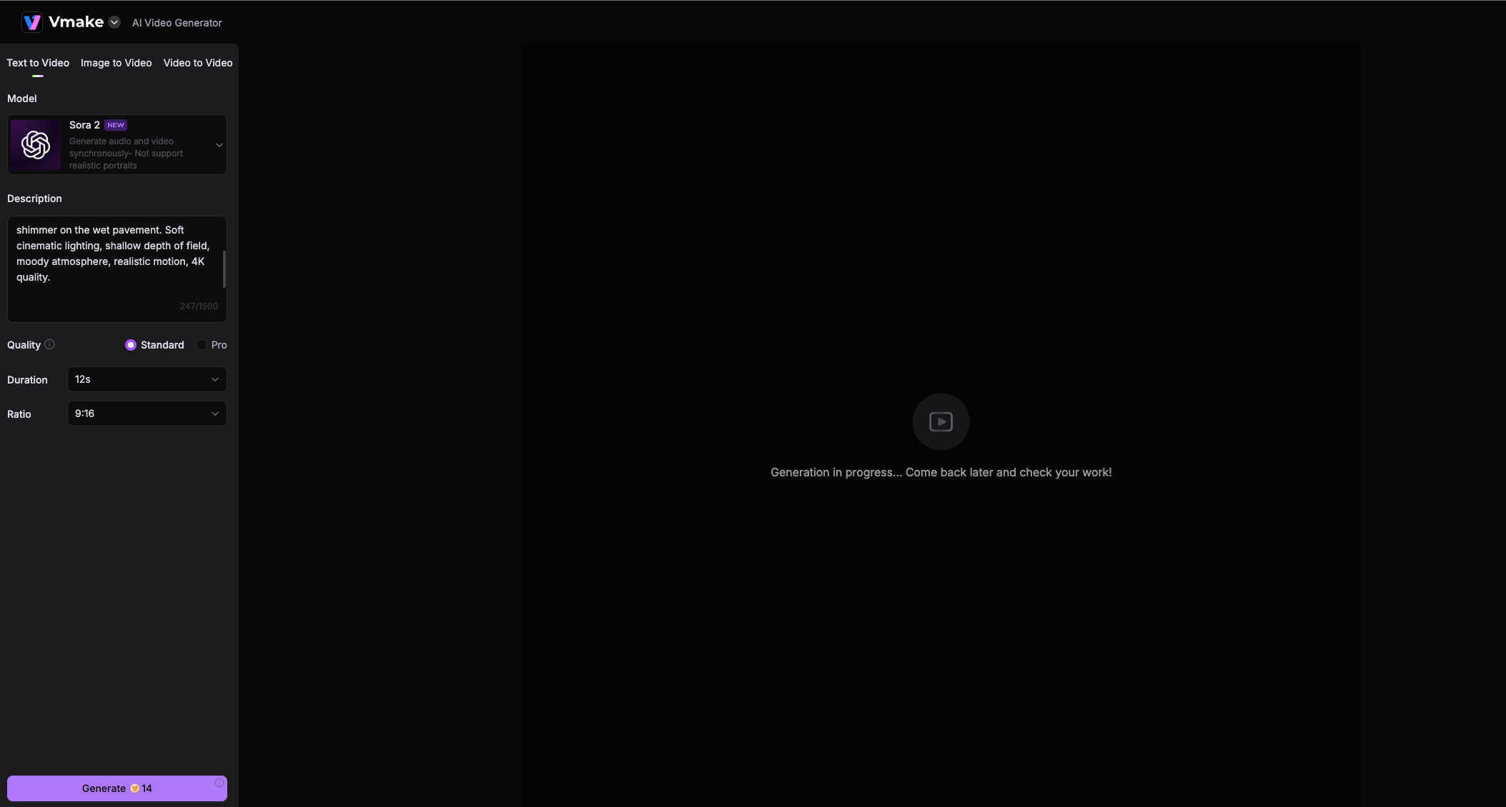 With the integration of OpenAI’s Sora 2 model, Vmake empowers everyone—from professional filmmakers to everyday creators—to produce cinematic-level videos directly from text and images. You can now bring your imagination to life with unmatched realism, motion precision, and storytelling control, all within a simple web interface.