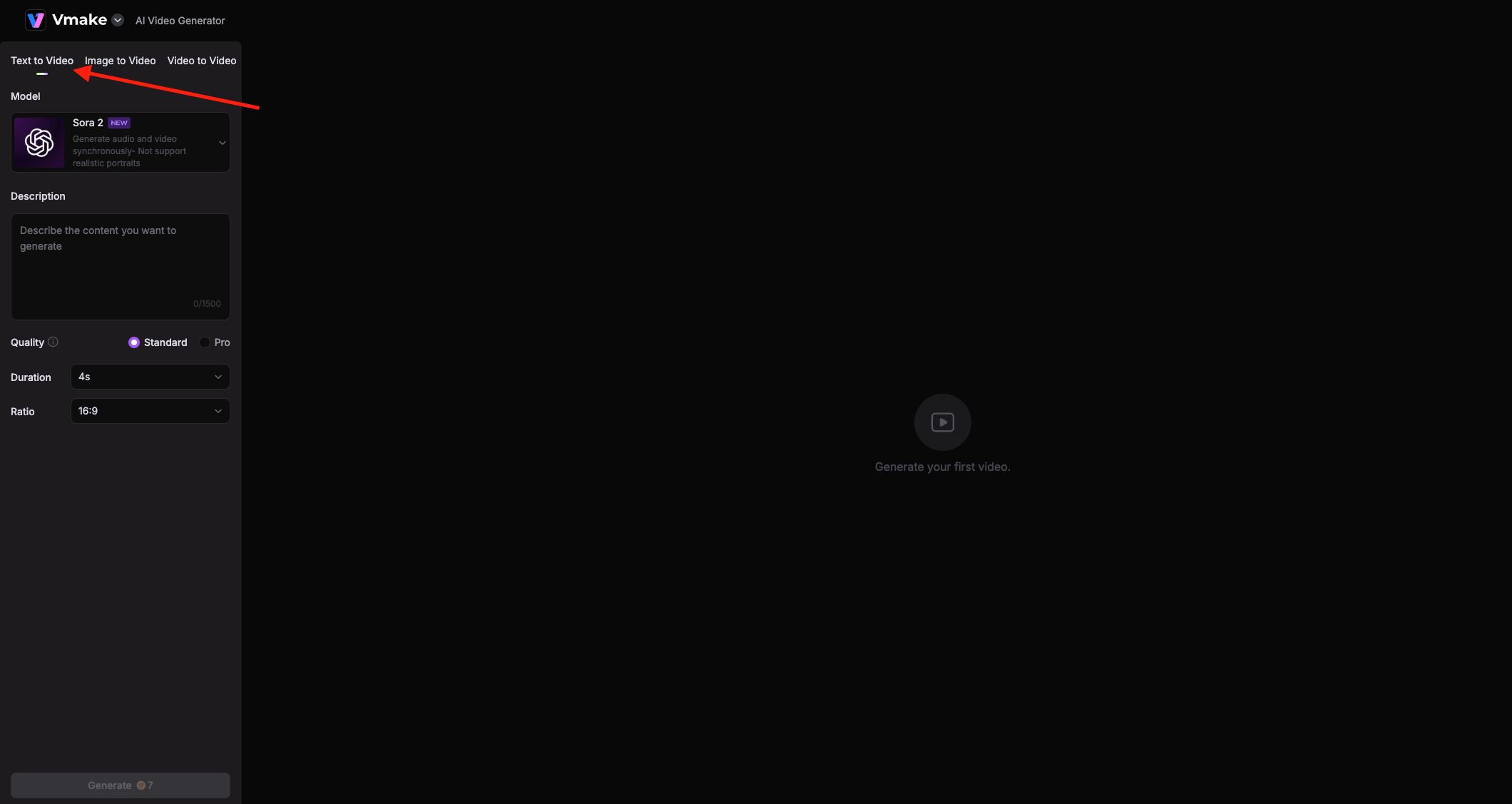 Visit Vmake and open AI Video Generator → choose the Text to Video tab.
