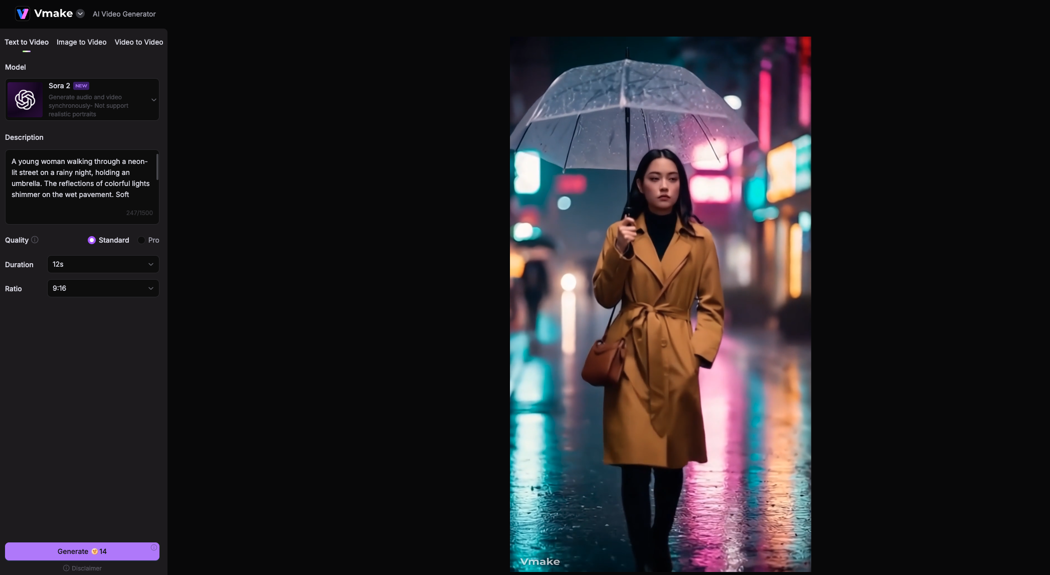 The Vmake AI Video Generator has made a quantum leap in capability after integrating the Sora 2 model. This means you only need to input a brief text description, or upload a reference image, and Vmake can generate a complete, highly realistic video that adheres to the laws of physics.