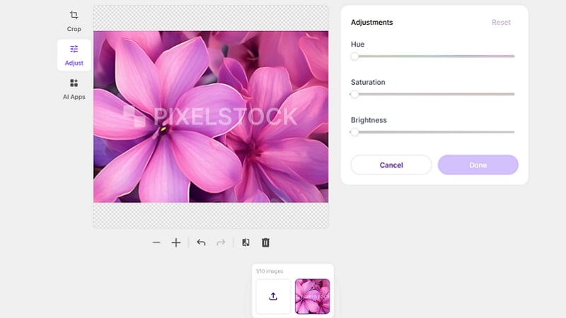 - Image Adjustment: You can also crop the image dimensions and adjust parameters such as hue, saturation, and brightness.