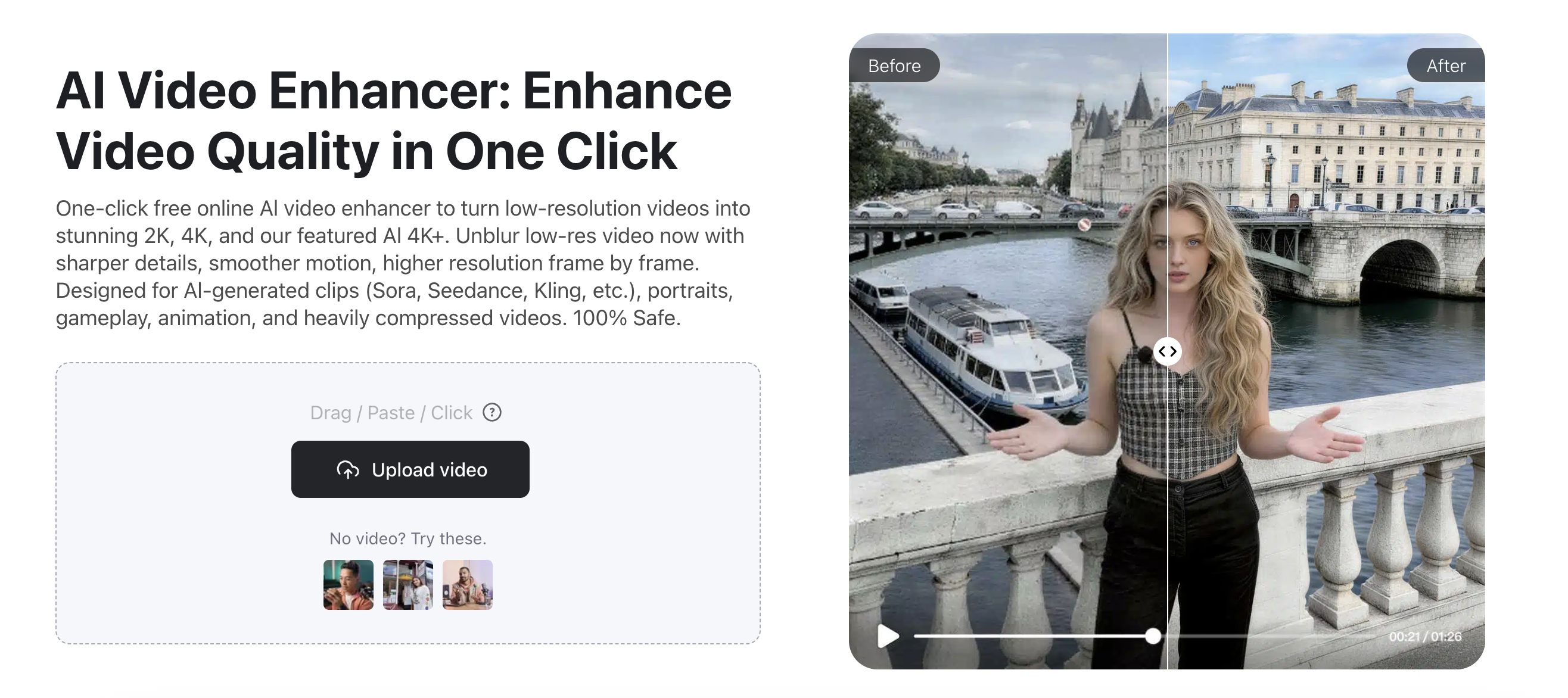 The Vmake AI Video Enhancer is specifically tuned for the nuances of AI-generated video. It doesn't just apply a sharpening filter; it uses a specialized reconstruction algorithm that: