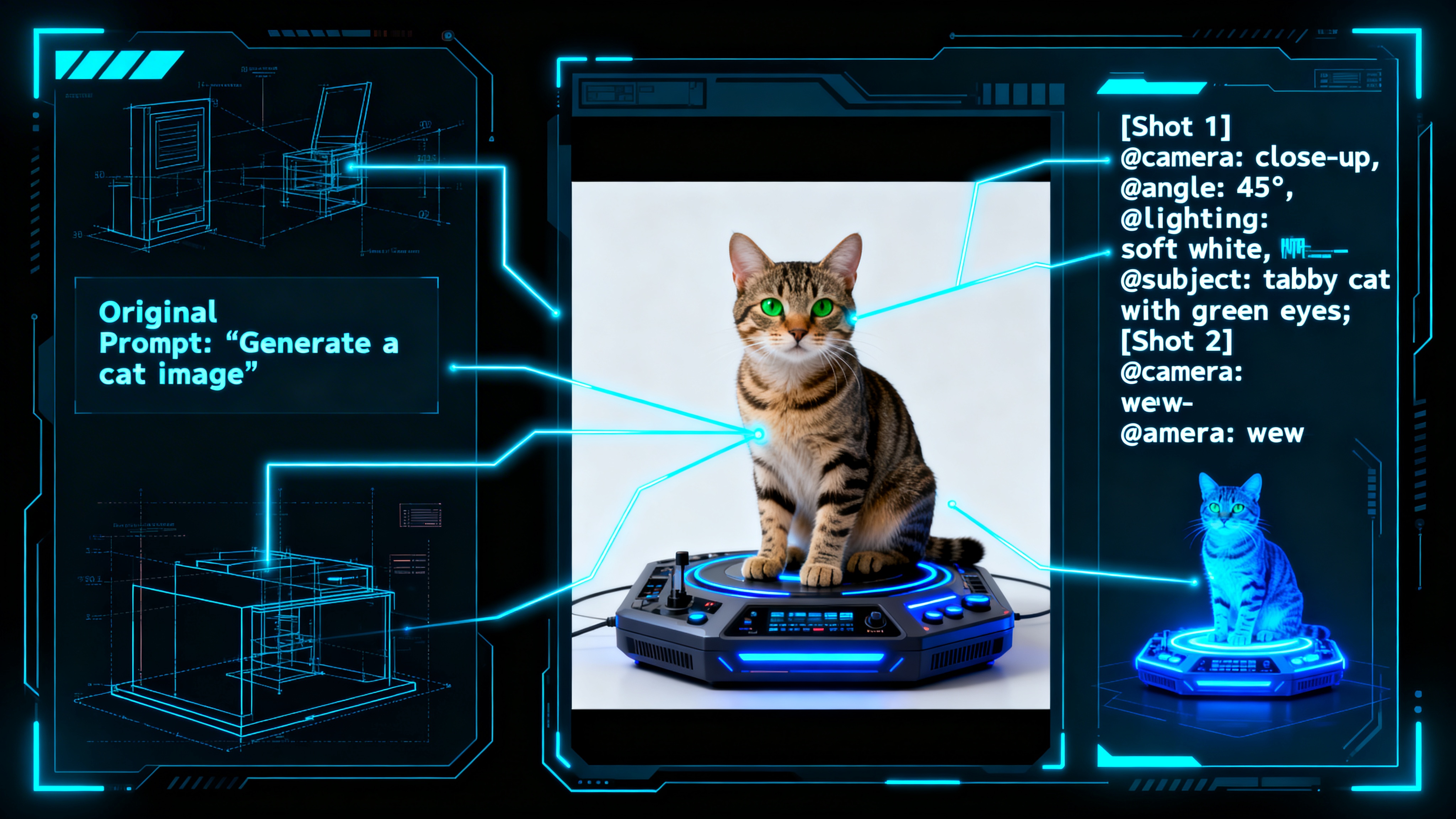 Prompt: [Shot 1: Wide shot] @Character1 standing on a cliff overlooking a futuristic Tokyo, neon lights reflecting in puddles. [Cut to: Extreme Close-up] @Character1’s eyes narrowing as a digital HUD overlays their pupil. Cinematic lighting, 35mm lens, high contrast, 4k.