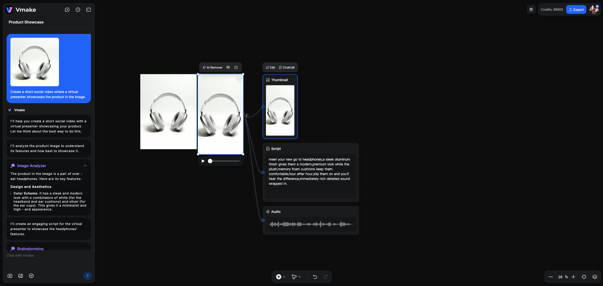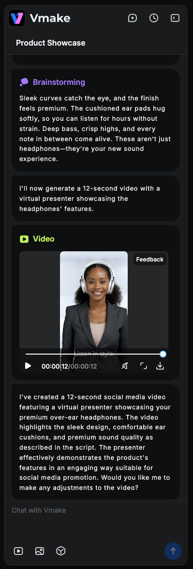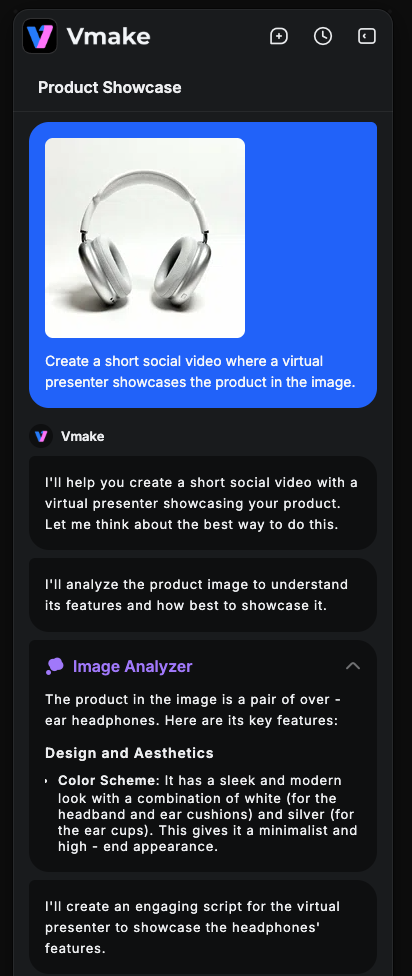 In a few seconds, the agent generates a full video featuring a natural human presenter who talks about the product as if they’re recording a real UGC clip. Before it even starts producing the video, Vmake’s Image Analyzer studies your product photo — color, texture, category, key selling points — and uses that understanding to brainstorm several possible angles for the script.
