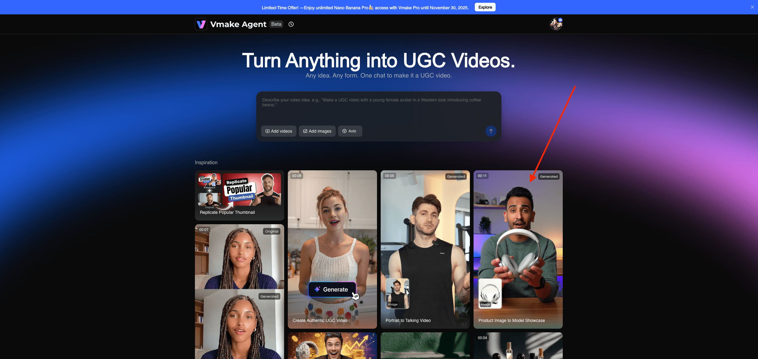 To get started, simply open Vmake Agent in your browser and click “Product Image to Model Showcase.” You’ll instantly experience how a single photo can transform into a real human UGC product video — giving you a head start this Black Friday.