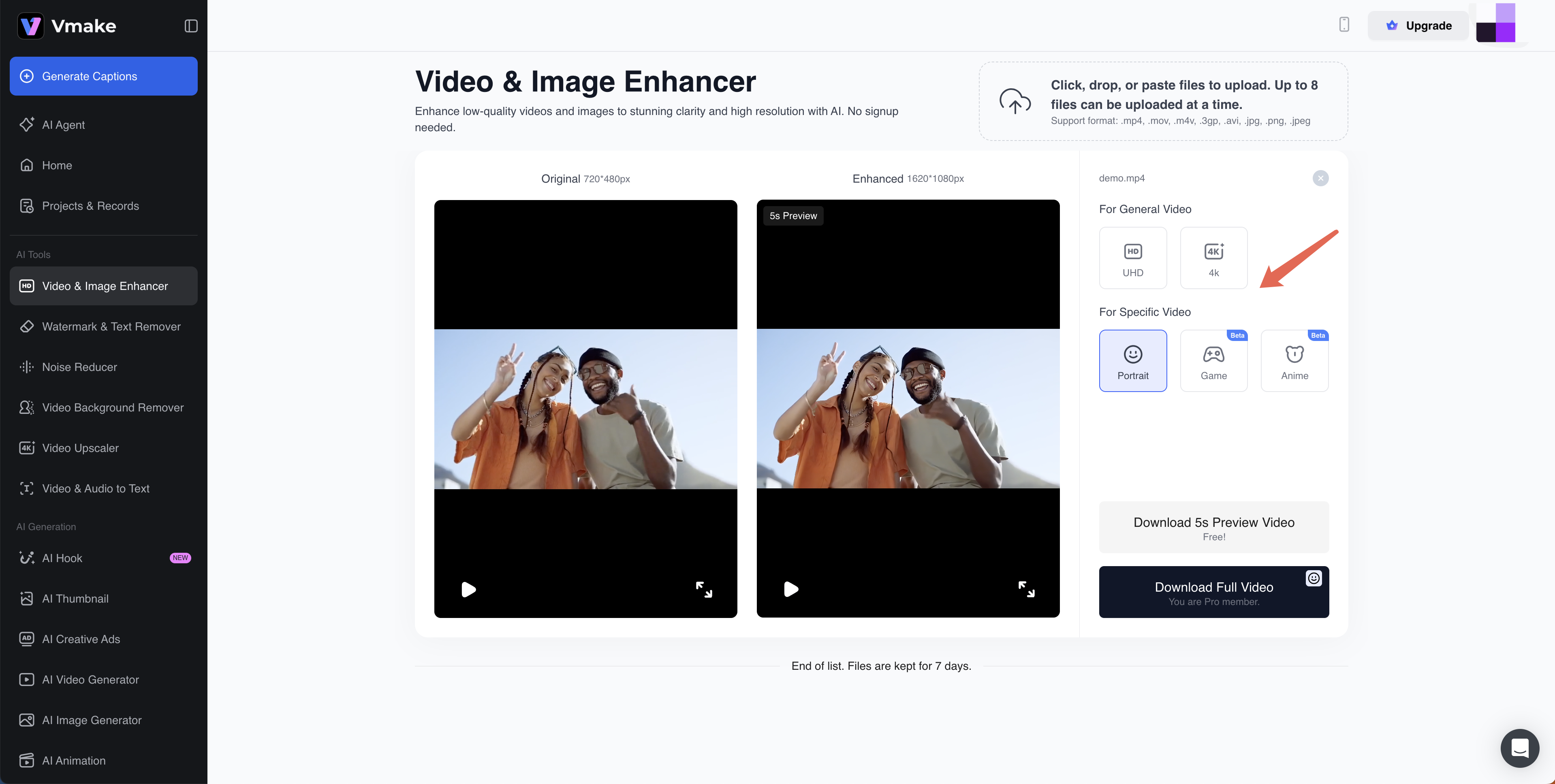 If you want the enhancement to better fit your video’s theme—like animation, cinematic footage, or real-life scenes—click “For Specific Video” and choose the most suitable scene type. This helps Vmake’s AI fine-tune the enhancement for color, texture, and lighting.