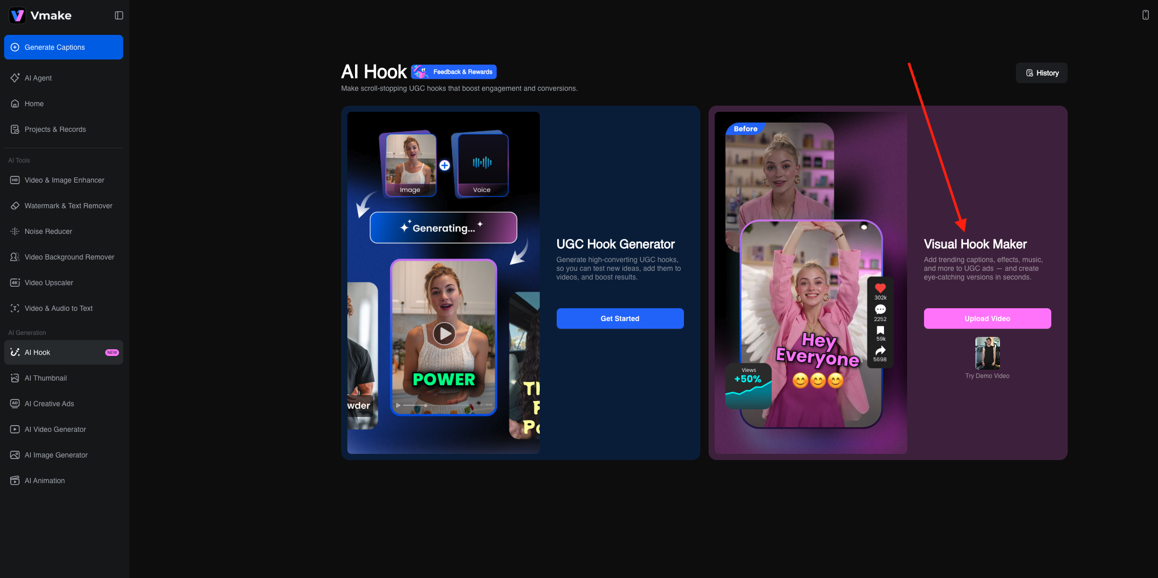 1. Navigate to the Vmake Visual Hook Maker and click on Hook Boost.