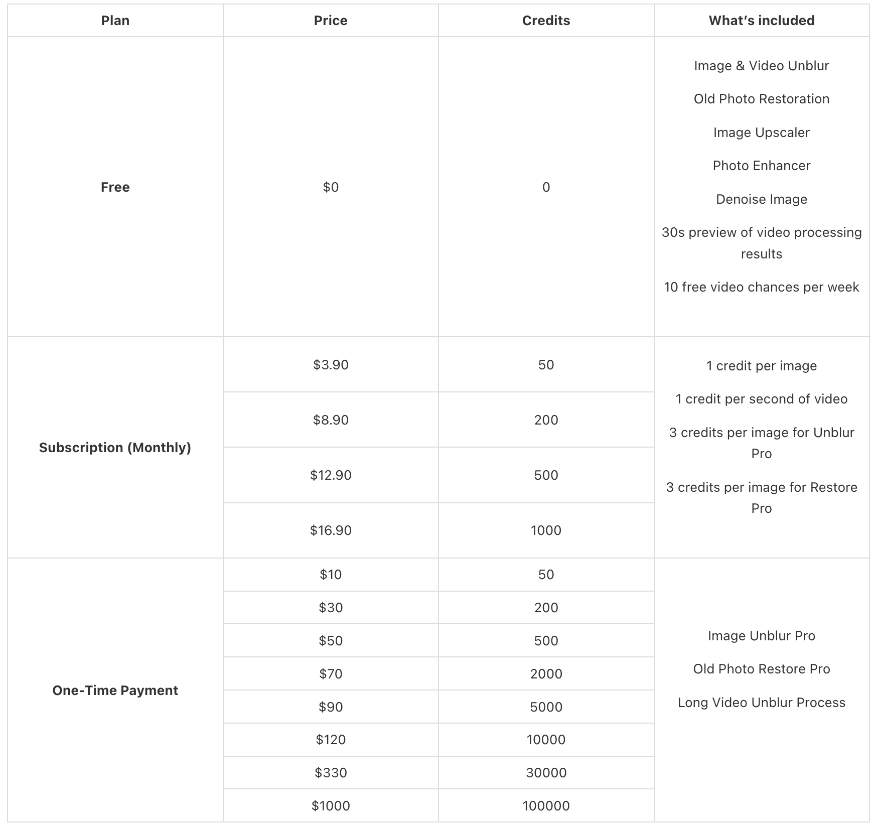 Unblurimage Video Enhancer supports both subscription and credits plans. Here is the table to better understand the pricing structure: