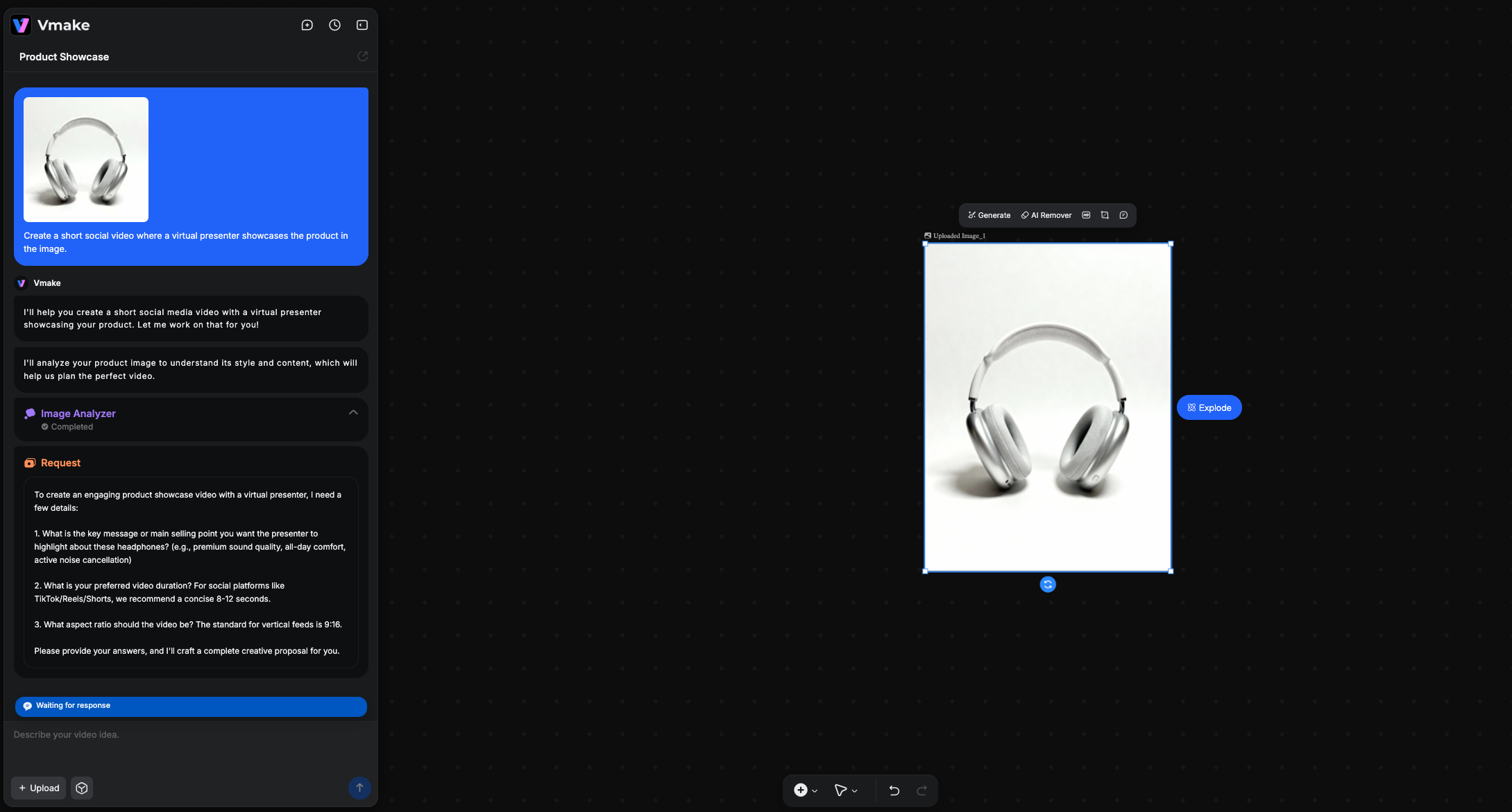 4. Interactive Customization: After uploading, Vmake will lead you through a series of guided conversational prompts to determine your specific UGC needs—such as the tone of the video, the target audience, and the key selling points you want to highlight.