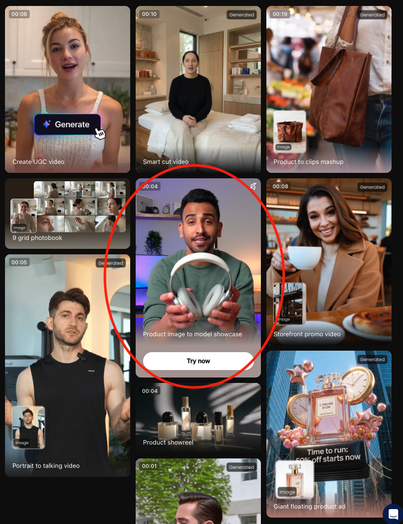 2. Pick a Method: Select the "Product Image to Model Showcase" template for a quick start, or enter a manual prompt: "Create a short video with a virtual presenter showcasing this product."